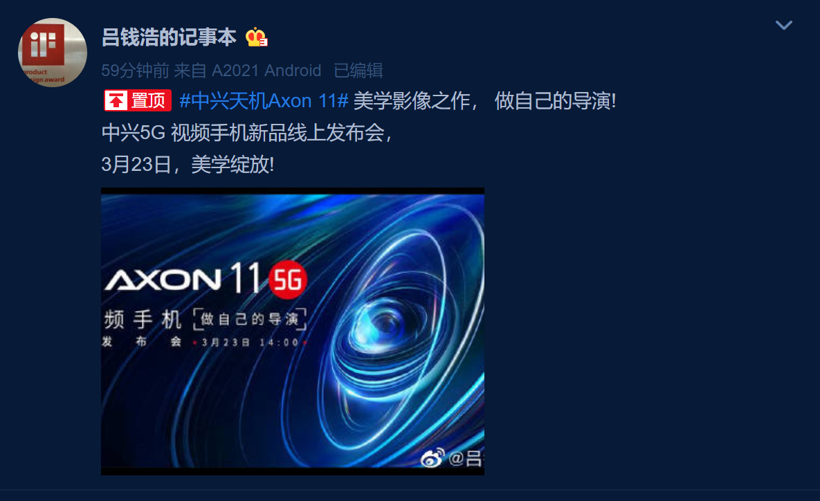 4月12日信息,中兴手机官方宣布:5G视频手机,做好自己的电影导演,中兴天机Axon11线上发布会,3月23日14:00在线视频直播,与你非同凡响。