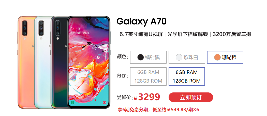 2019年4月10日晚,三星在曼谷举行了新产品发布会,在新品发布会上三星发布了新产品Galaxy A系列产品智能机,一款是精准定位中高档的旗舰手机三星Galaxy A80,也有一款是配备稍微稍逊的三星Galaxy A70,现阶段A70已登录三星官网打开预订。