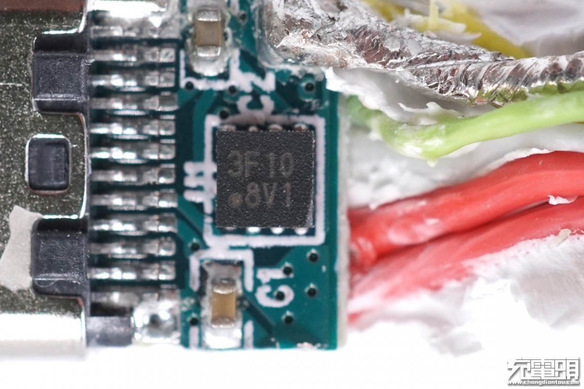 E-Marker芯片特写,丝印3F10。小米原装100W USB-C to USB-C数据线的E-Marker芯片也有类似丝印。