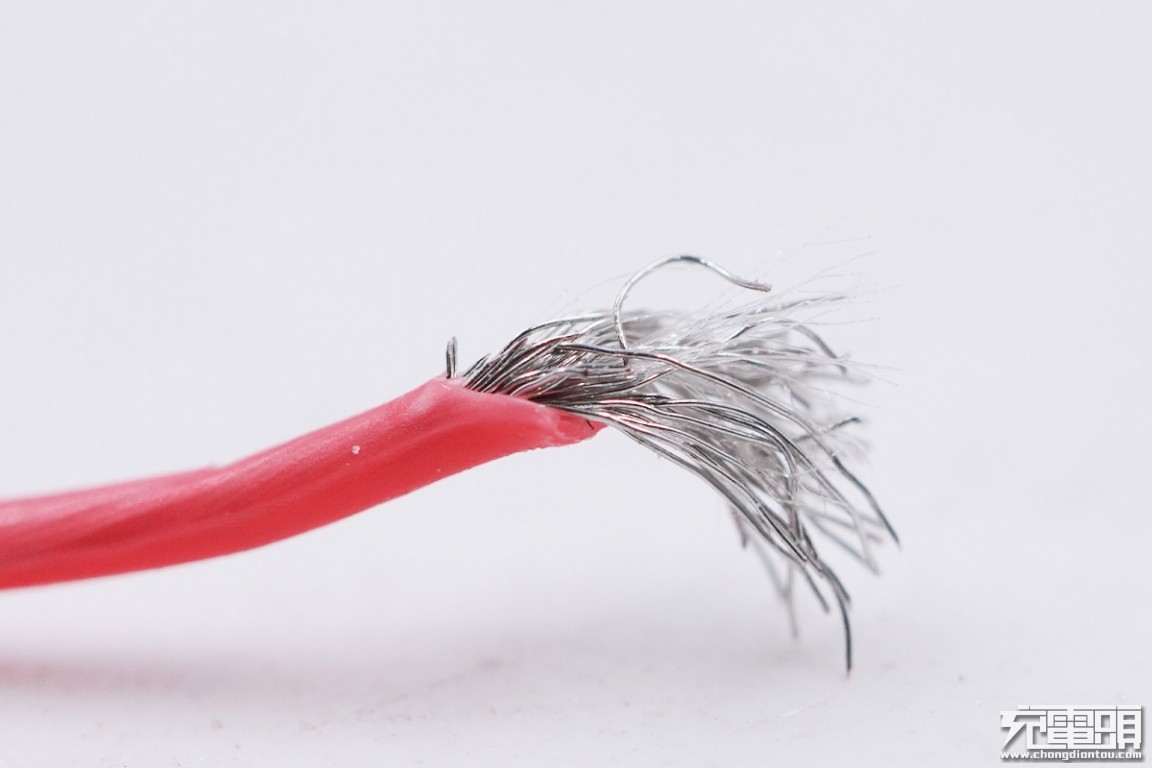 再来看一下线材的横截面,很容易看得出其中7根线芯的线径大小,其中两根红色正极导线加粗设计,负极采用裸线。