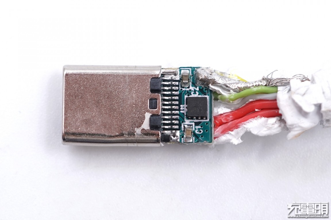 将线头塑料壳以及内部封胶拆掉,公头和PCB板连接处焊接12根针脚,满PIN设计,此外还有一颗E-Marker芯片。